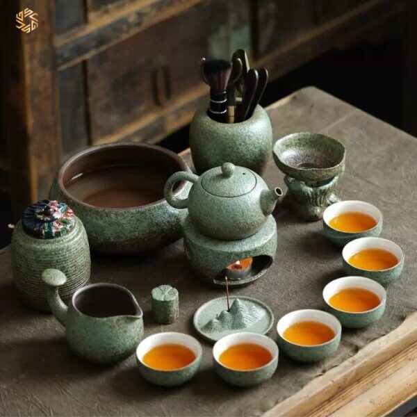 - Bộ Trà gồm : Ấm pha trà dung tích 200ml, tống trà dung tích 260ml, đế kê ấm, kháo trà, 6 chén mỗi chén dung tích 60 ml, lọc trà và đế kê, bộ dụng cụ và ống đi cùng. Bộ sản phẩm gồm hộp đựng cao cấp đi cùng, thuận tiện trong quá trình sử dụng và biếu tặng.