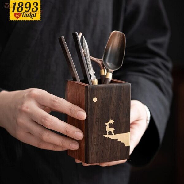- Ống đựng dụng cụ chất liệu gỗ mun, hoạ tiết thủ công bằng đồng.