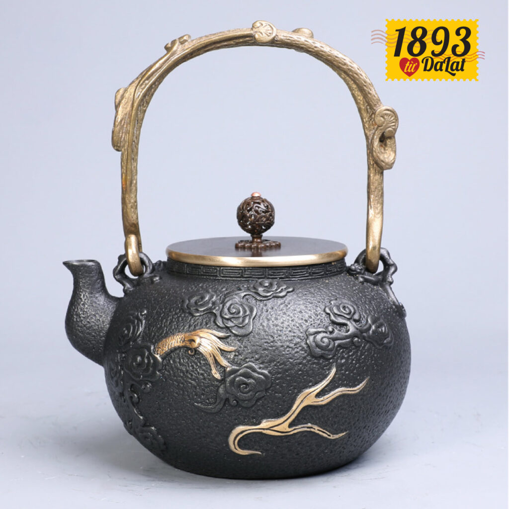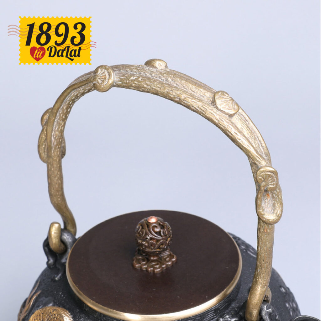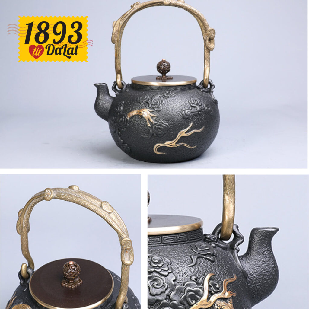 Ấm pha trà mạ vàng bằng gang đúc thủ côngChất liệu: Nồi bằng gang, nắp đồng nguyên chất, dầm nâng bằng đồng , tay cầm bằng sắt mạ vàng hình rồng mây lớn tinh tế.Tính năng: cải thiện chất lượng nước, nâng cao độ ngon và ngậy của trà.Dung tích: khoảng 1.2L