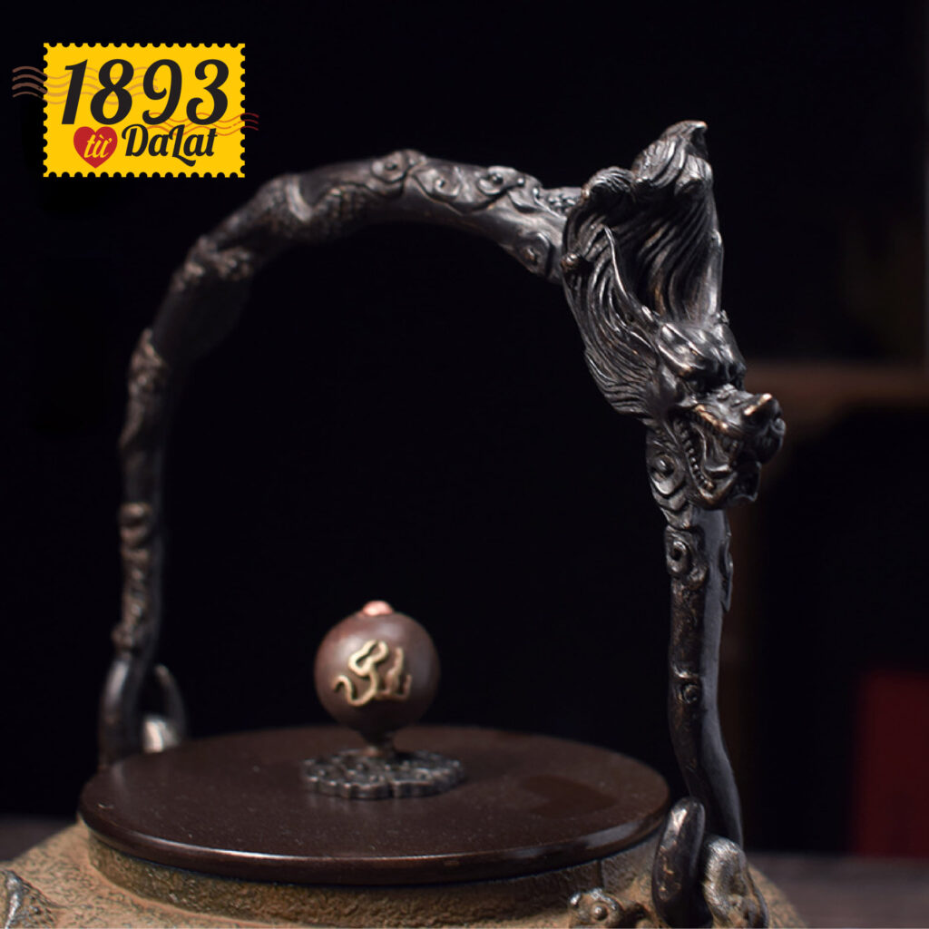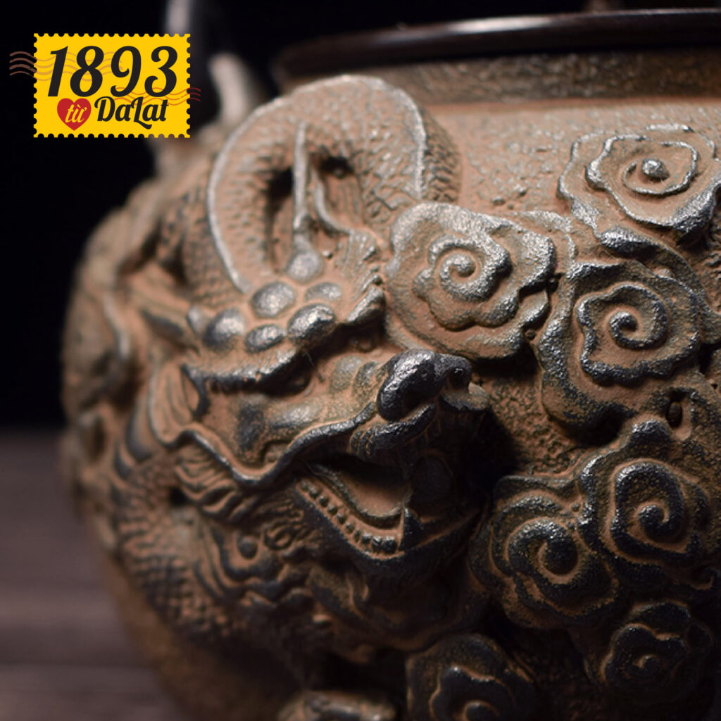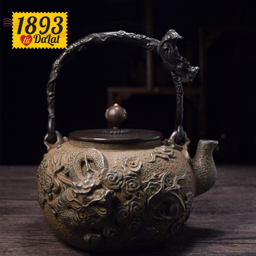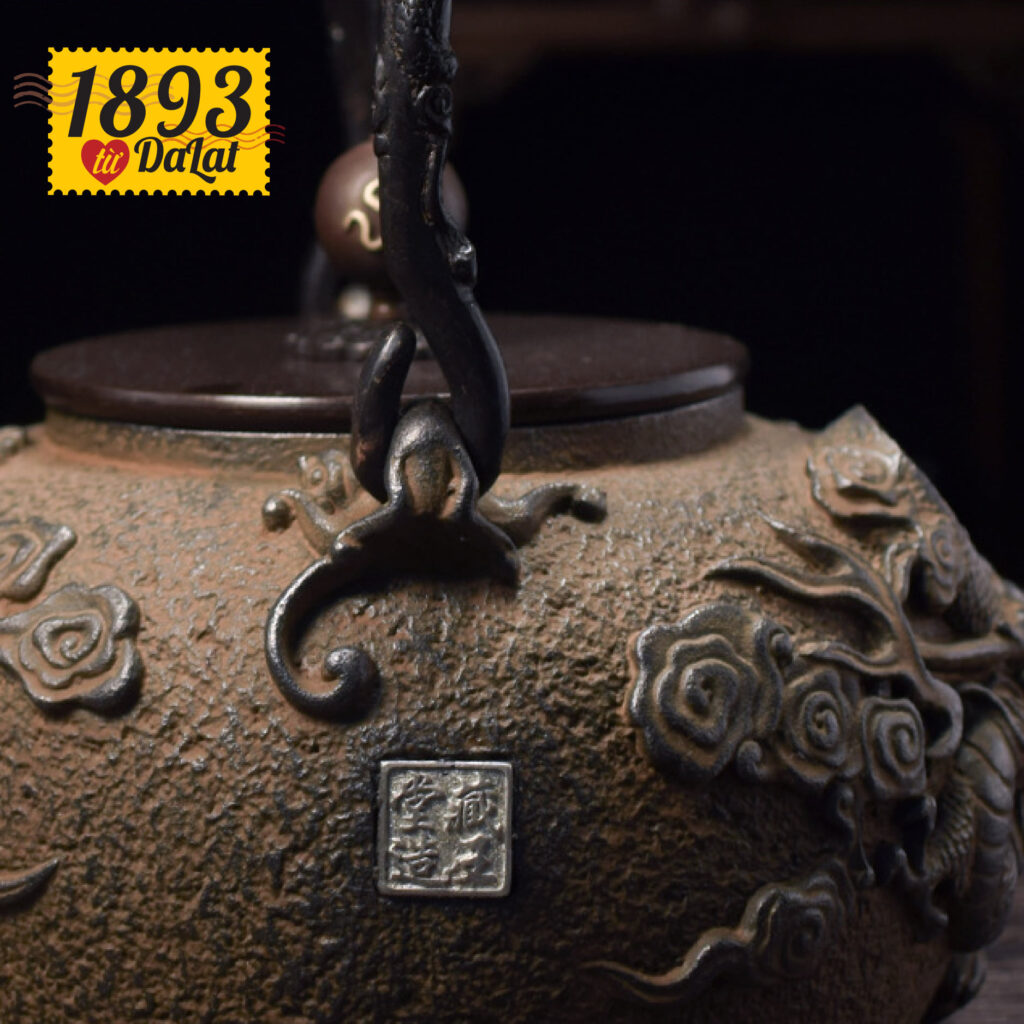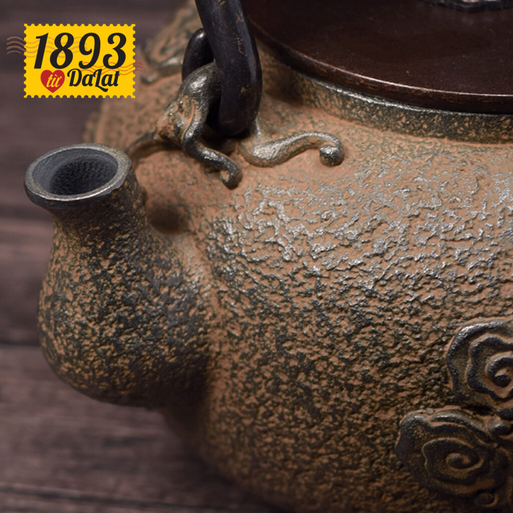 Ấm pha trà bằng sắt đúc thủ công. Dòng nước chảy ra êm và lắp được chạm khắc bằng đồng nguyên chất.