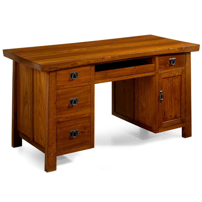 This handsome desk, like the rest of our Asian Contemporary furniture range, is made in solid elm wood. It has a pull out shelf for a computer keyboard, four drawers and a cabinet section – useful for storing a tower PC. The sides are slightly tapered and the deep, extended top makes a wonderful work surface – the wide grain of the elm wood showing through our ‘mid elm’ finish. A beautiful addition to any home office.