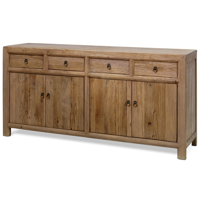This four-door sideboard provides generous storage space, making it an excellent choice for bedrooms or living spaces. Each of the two cupboard sections has a removable shelf, while the four upper drawers add extra room. The large doors and thick frames highlight the beautiful, natural finish of the rich, textured elm wood.