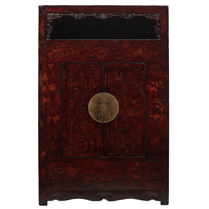 This stunning painted armoire, with its impressive size and proportions, would make a fantastic statement piece – though you would need a large space to house it! It comes from Shanxi province in central China and still has its original red lacquer finish and paintings. This style of cabinet, with an open shelf section above the doors, is known as ‘wanli’ in Chinese. The top shelf is framed with wonderful open carvings that include a central long life symbol and a bat (symbolising good fortune) at each corner. This would have held prized ornaments, with books and other personal items stored inside the cupboard section. The paintings on the doors and outer panels, now less vibrant than they once were but still clearly visible, show flowers, birds, butterflies and blossom in now muted browns. There are also inscriptions in Chinese characters painted just below the shelf and on the bottom apron – most likely messages for good fortune to the recipient of the cabinet or details of when and where it was presented. The artist’s ‘chop’ is also still visible towards the top left of the cabinet. The heavy brass hardware is concaved and at 33cm diameter is in proportion to the doors. Inside the cabinet there are two removable shelves, as well as a third plank shelf that sits over the ‘hidden compartment’ at the bottom. This is a unique, extraordinary piece – sure to impose itself as the ultimate statement furniture in the right setting. Please note that it is extremely large and heavy so be sure to check access before ordering and call us to discuss delivery options.