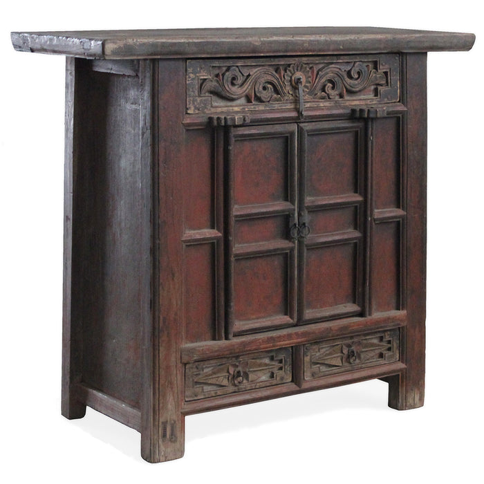 This beautiful cabinet, with doors set centrally on small hinges and multiple frames and panels, is in a style referred to as a ‘Buddha cabinet’, produced specifically to hold a statue of the Buddha inside. Originally the doors and front panels would have been in a striking, bright red lacquer that contrasted with the black top surface. The drawers at the top and bottom would have been painted to pick out the deep relief carvings. Over time the colours have worn and faded to give a more subtle look and a gorgeous patina that would fit more easily into any interior.
